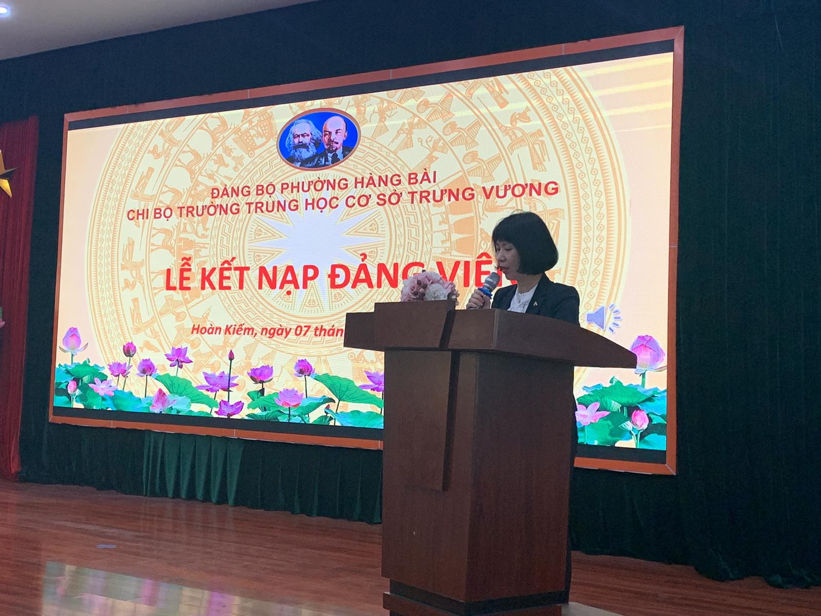 Đồng chí Dư Thị Lan Anh – Phó Hiệu trưởng nhà trường, Bí thư chi bộ lên trao quyết định kết nạp Đảng viên của Ban thường vụ Quận ủy Hoàn Kiếm tới 04 đồng chí đảng viên mới.