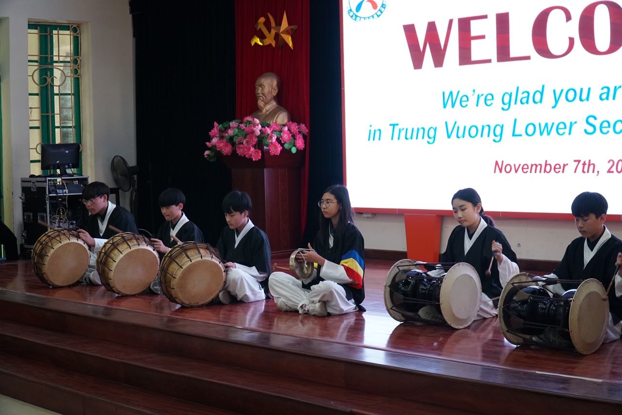 Điểm nhấn trong buổi lễ tiếp đón sáng ngày 07/11 là tiết mục âm nhạc truyền thống - màn biểu diễn trống rất đặc biệt do các bạn học sinh đến từ trường KISH và trường JISA trình bày. Để đáp lễ, các em học sinh trường THCS Trưng Vương cũng đem đến một tiết mục âm nhạc đậm chất Việt Nam và vô cùng sôi động.