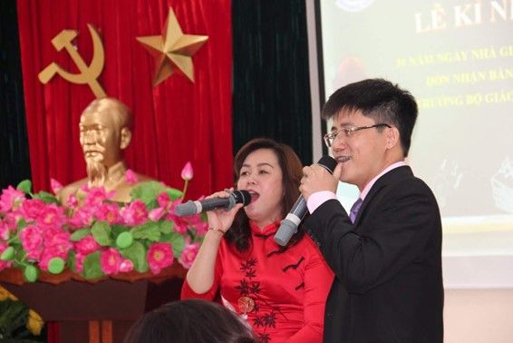 Cô Bích Ngọc trong một tiết mục song ca cùng giáo viên nam nhà trường