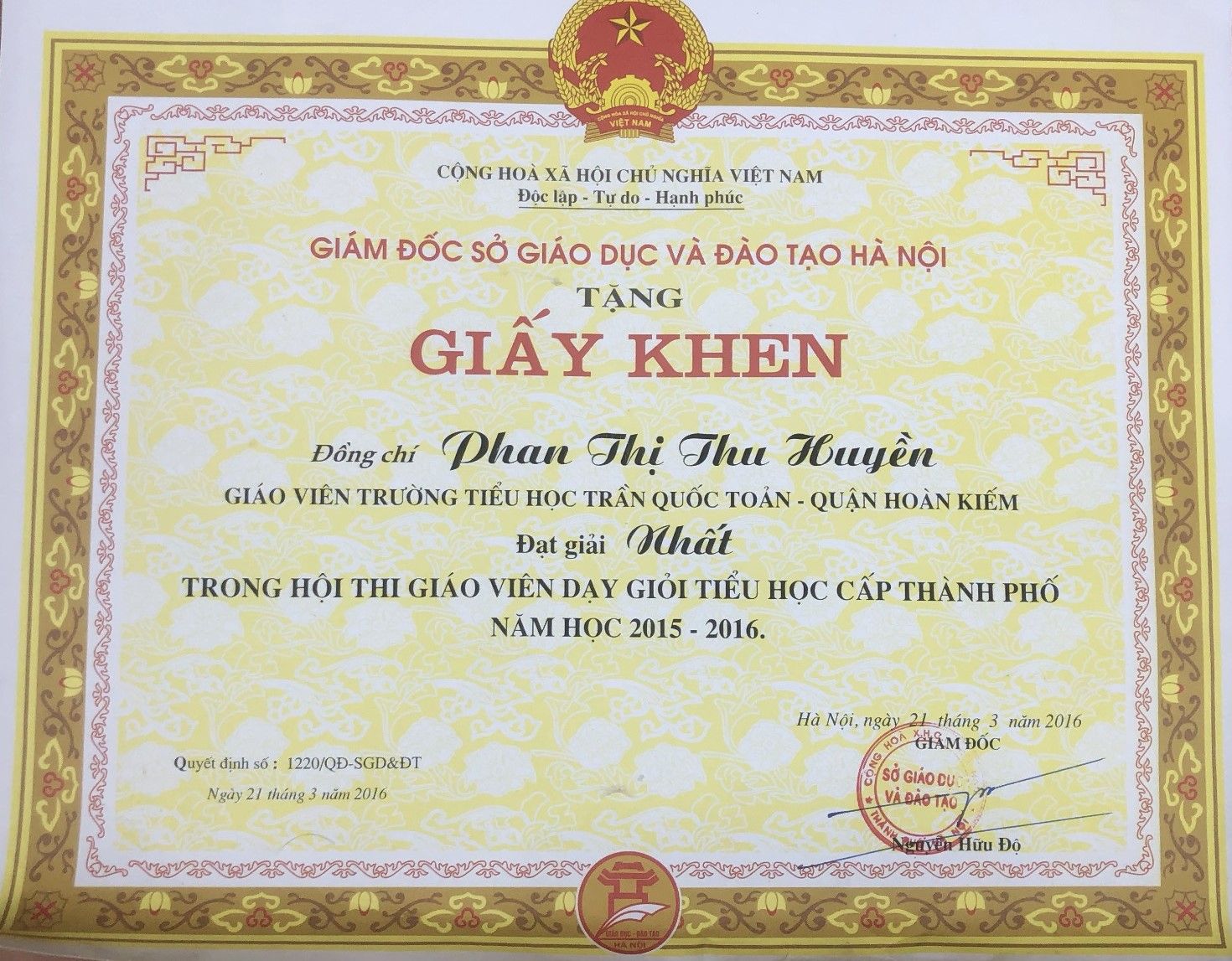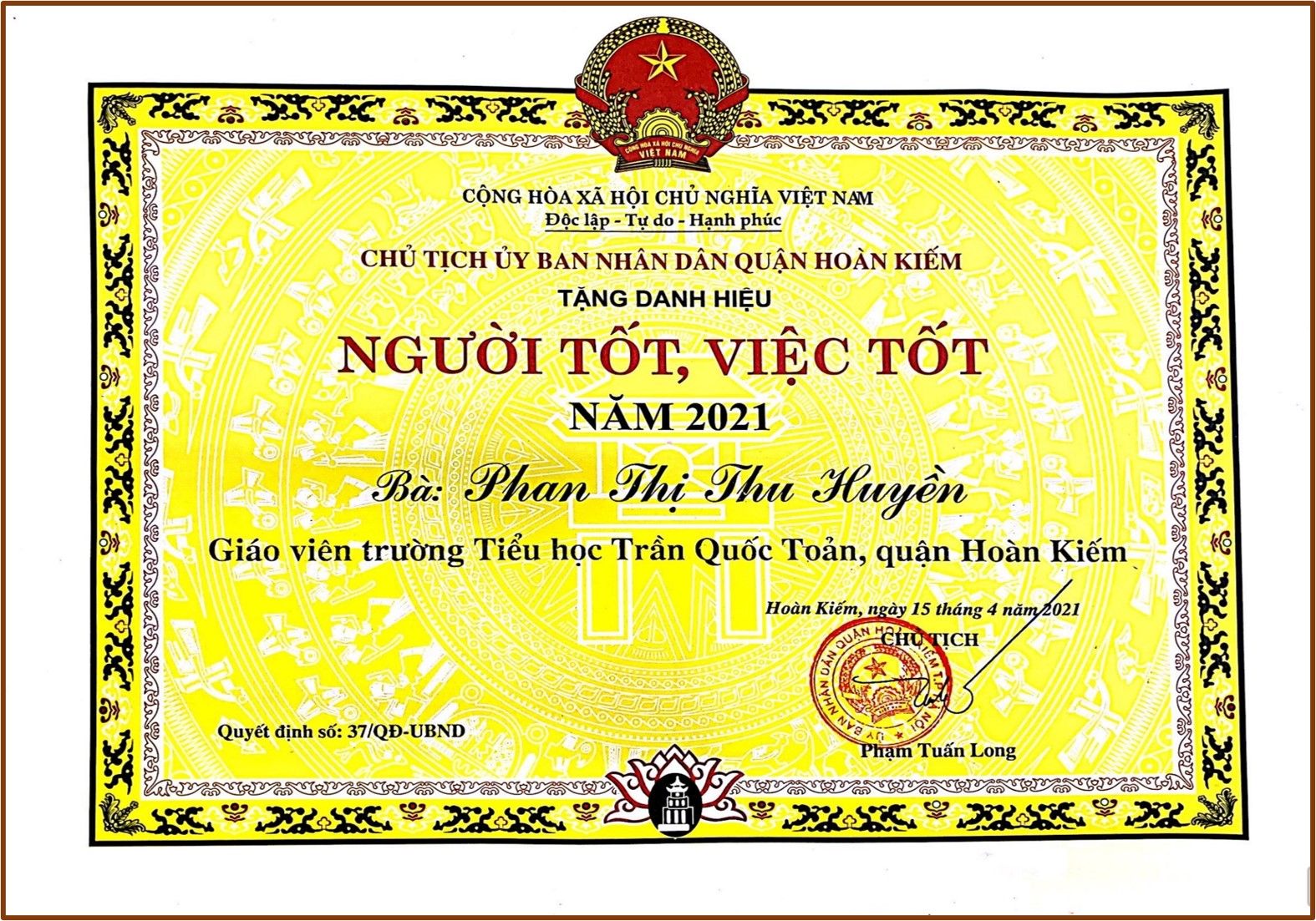 Có thể nói, với lòng tận tâm trong sự nghiệp “trồng người” cô giáo Phan Thu Huyền đã cống hiến hết mình cho sự nghiệp giáo dục của trường TH Trần Quốc Toản. Cô thật xứng đáng là một giáo viên tiêu biểu trong ngành và là tấm gương sáng để các giáo viên và học sinh học tập và noi theo.