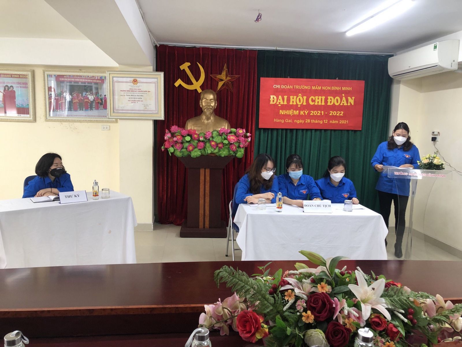 Tại đại hội, Đoàn chủ tịch đã trình bày báo cáo công tác hoạt động của chi đoàn trong nhiệm kỳ 2020 - 2021; báo cáo kiểm điểm của Ban Chấp hành nhiệm kỳ 2020 - 2021. Trong nhiệm kỳ 2020 - 2021, công tác của Chi Đoàn TNCS Hồ chí Minh Trường Mầm non Bình Minh được sự quan tâm chỉ đạo của BTV Đoàn phường và được sự quan tâm của Chi bộ, BGH nhà trường, Chi đoàn đã duy trì tốt các hoạt động do phường đề ra. Với sự nỗ lực, nhiệt tình của các đoàn viên trong chi đoàn, trong nhiệm kỳ 2020-2021 chi đoàn đã tích cực tham gia các hoạt động do trường tham gia các ý tưởng hiệu quả như xây dựng môi trường lấy trẻ làm trung tâm, xây dựng lớp học hạnh phúc, trường học xanh...; khẳng định được vai trò và sự đóng góp của Đoàn thanh niên với sự phát triển chung của nhà trường và tham gia các hoạt động của phường phát động như: các hoạt động trong công tác bầu cử quốc hội và đại biểu hội đồng nhân dân các cấp, công tác phòng chống Covid, phong trào hiến máu tình nguyện.....Chi đoàn đã giới thiệu được 03 đoàn viên ưu tú cho Đảng để bồi dưỡng kết nạp là đồng chí Đào Bích Thủy, Nguyễn Thị Lan Anh, Nguyễn Thị Thanh Trang. Bên cạnh đó, với tính đặc thù của chi đoàn, những mục tiêu hướng tới trong công tác chính là Xây dựng tổ chức Đoàn vững mạnh về chính trị, tư tưởng; phát huy vai trò nòng cốt chính trị, tập hợp thanh niên, tạo môi trường, điều kiện thuận lợi để phát huy tinh thần xung kích tình nguyện của Đoàn Thanh niên trong thời kỳ mới. Đại hội cũng đã xác định phương hướng, chỉ tiêu phấn đấu của chi đoàn trong nhiệm kỳ 2021- 2022. Với tinh thần làm việc khẩn trương, nghiêm túc, Đại hội đã bầu ra Ban chấp hành khóa mới gồm 3 đồng chí và đ/c Nguyễn Thị Thanh Trang được bầu giữ chức Bí thư Chi đoàn. Đồng chí Đào Bích Thủy- Phó Bí thư Chi đoàn. Đồng chí Nguyễn Kim Thanh ủy viên BCH Chi đoàn TNCS Hồ Chí Minh Trường Mầm non Bình Minh nhiệm kỳ 2021 – 2022