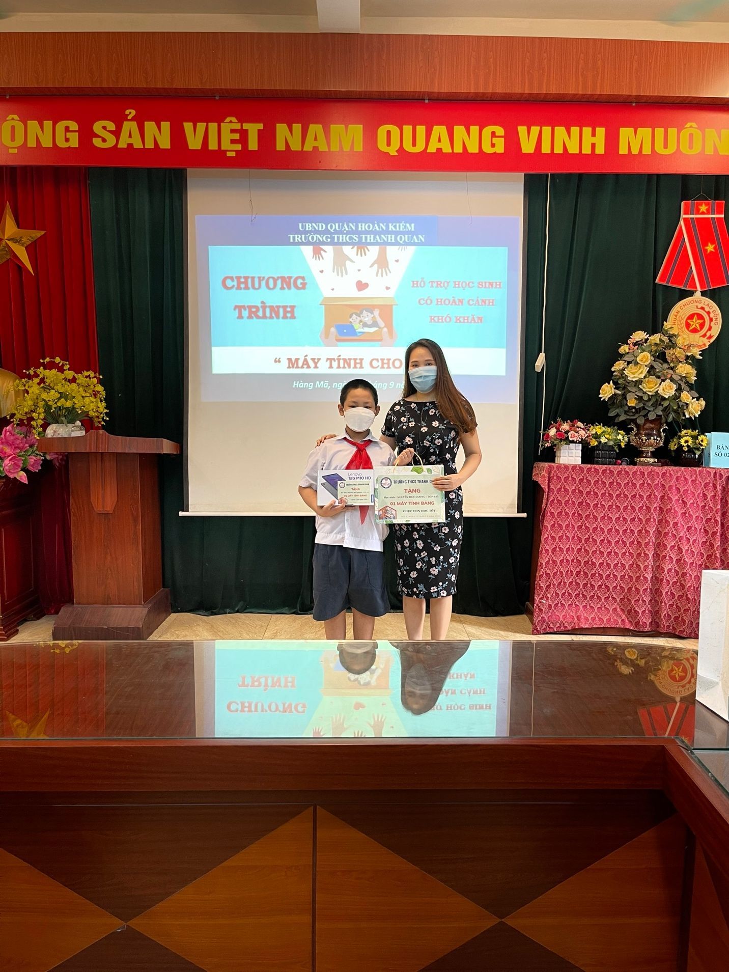 Đồng chí Vương Hương Giang - Quận ủy viên, Trưởng phòng Giáo dục và Đào tạo quận Hoàn Kiếm thay mặt ngành tặng 30 bộ máy tính cho học sinh có hoàn cảnh khó khăn trên địa bàn thành phố Hà Nội