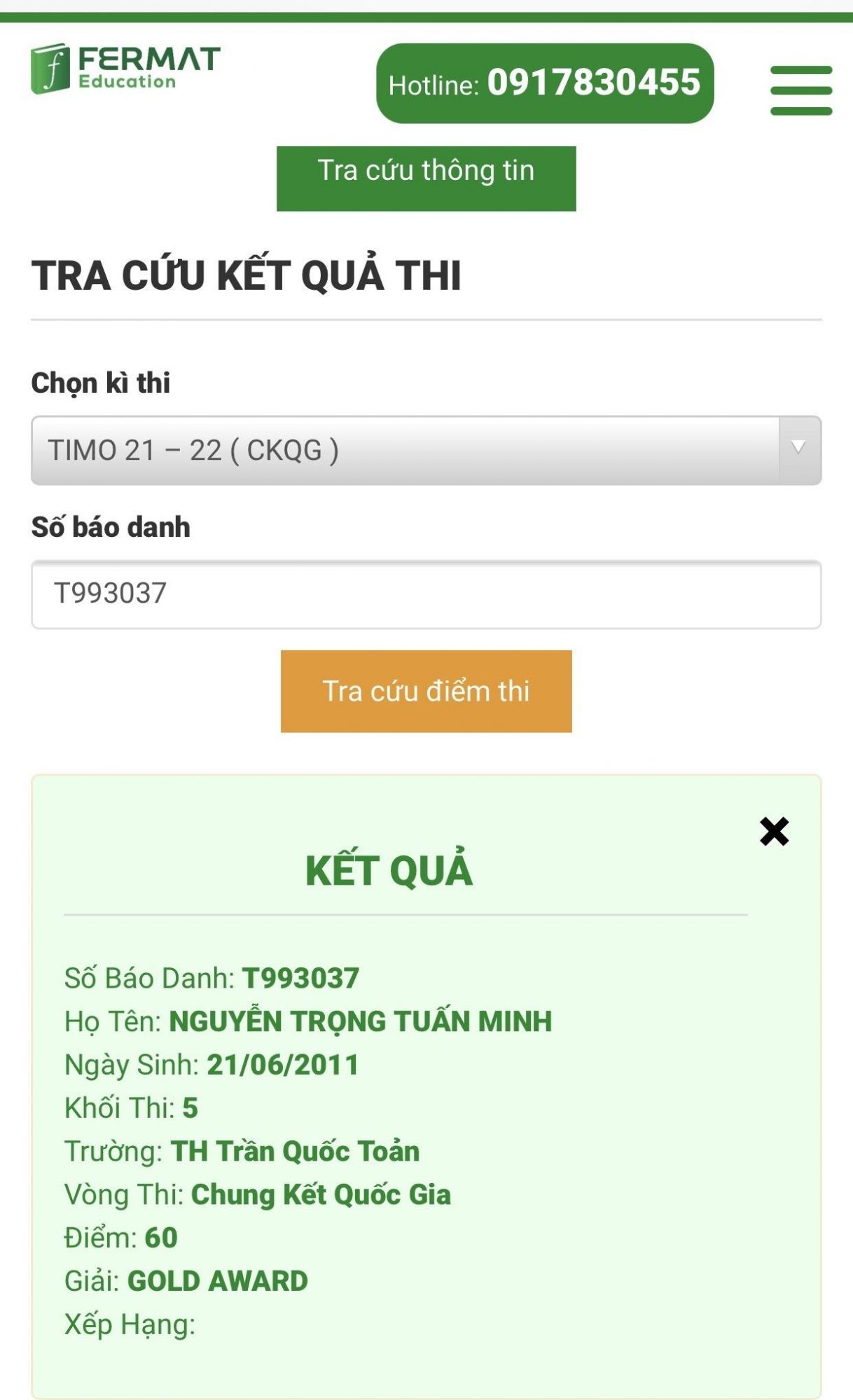 Thành tích xuất sắc của bạn Nguyễn Trọng Tuấn Minh tại vòng Chung kết Quốc gia Kỳ thi Olympic Toán TIMO 2021- 2022.