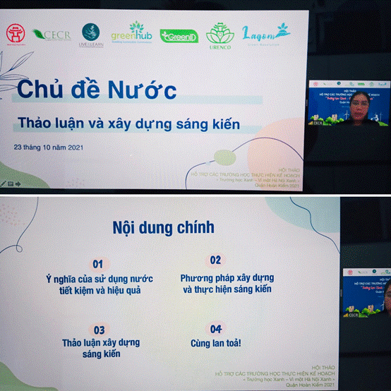 Sau phần phát biểu khai mạc, đồng chí Trịnh Thị Minh Phương - Phó trưởng phòng Tài nguyên môi trường Quận Hoàn Kiếm đã giới thiệu những trung tâm hỗ trợ các nhà trường trong việc triển khai những chủ đề của chương trình gồm: CECR, Live&Learn, Greend ID, GreenHub, URENCO Hoàn Kiếm, Lagom.