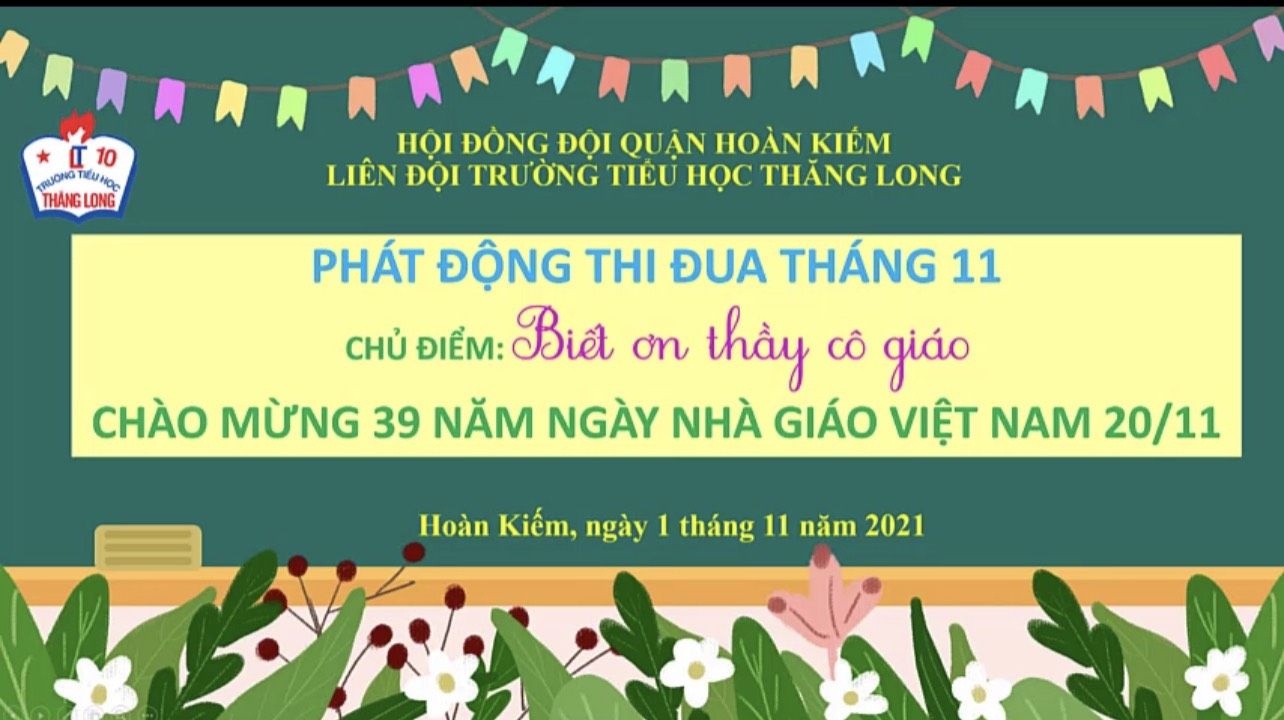 Liên đội Tiểu học Thăng Long đã triển khai linh hoạt, sáng tạo các hoạt động trong tháng 11 chào mừng kỉ niệm 39 năm ngày Nhà giáo Việt Nam 20/11. Các hoạt động theo chủ điểm diễn ra trong tháng phù hợp với tình hình thực tế đảm bảo công tác phòng chống dịch an toàn. Qua những hoạt động tuy đơn giản nhưng mang tính tuyên truyền và giáo dục cao chứa đựng nhiều cảm xúc yêu thương, lan tỏa năng lượng tích cực tới các thầy cô giáo. Góp phần giáo dục truyền thống cho các em học sinh, tạo sân chơi lành mạnh giúp các em sẽ có những hoạt động ý nghĩa trong thời gian học trực tuyến.