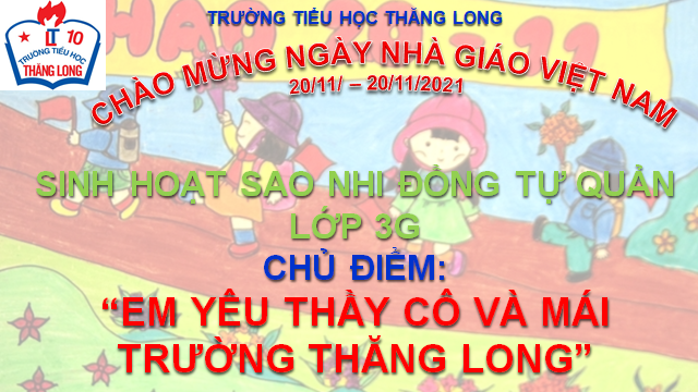 Tiếp tục với những hoạt động thi đua sôi nổi chào mừng ngày Nhà giáo Việt Nam 20/11, liên đã hướng dẫn tổ chức sinh hoạt Sao Nhi đồng tự quản cho các em học sinh khối 3 theo chủ điểm “Em yêu thầy cô và mái trường Thăng Long”. Buổi sinh hoạt Sao Nhi đồng gồm 3 hoạt động chính. Ở hoạt động 1, các em học sinh lớp 3 trường say sưa tìm hiểu lịch sử và ý nghĩa ngày Nhà giáo Việt Nam. Hoạt động 2, các em cùng nhau triển lãm và trưng bày các sản phẩm sáng tạo để chào mừng ngày Nhà giáo Việt Nam 20/11. Đến với hoạt động 3, các em hào hứng với trò chơi Đuổi hình bắt chữ với nội dung về các câu ca dao tục ngữ tôn vinh truyền thống Tôn sư trọng đạo của dân tộc ta.