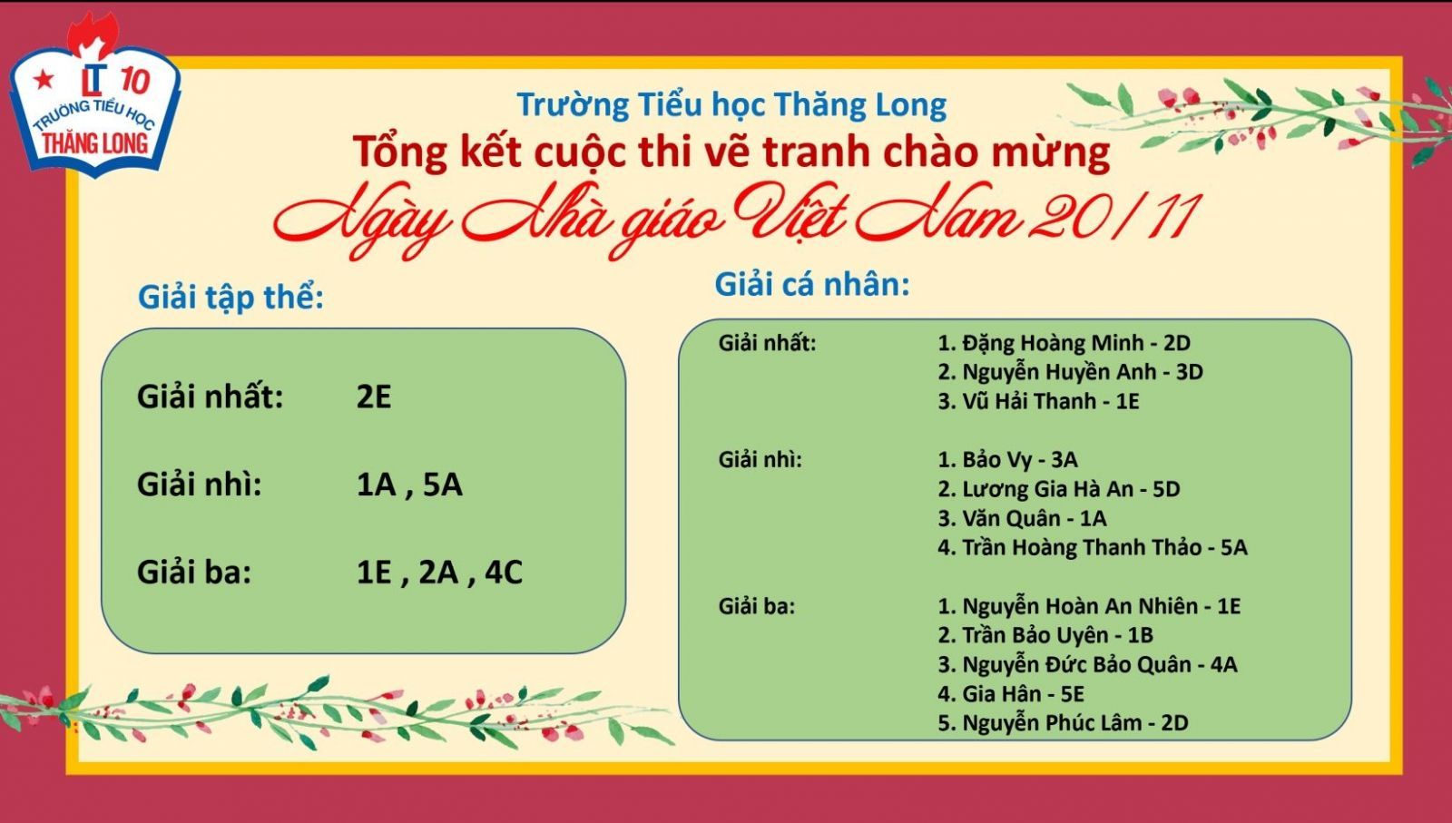 Và đặc biệt là nội dung thi vẽ tranh, thiết kế poster, làm thiệp chúc mừng, quay clip tiết mục văn nghệ với chủ đề “Em yêu thầy cô và mái trường Thăng Long” được các em học sinh vô cùng thích thú và hào hứng tham gia. Đã có rất nhiều tác phẩm hay, ý nghĩa tham gia dự thi, ban giám khảo gồm các cô trong Ban giám hiệu, các thầy cô mỹ thuật, âm nhạc, cô Tổng phụ trách đã chấm và trao giải cho các tập thể lớp và các cá nhân xuất sắc.