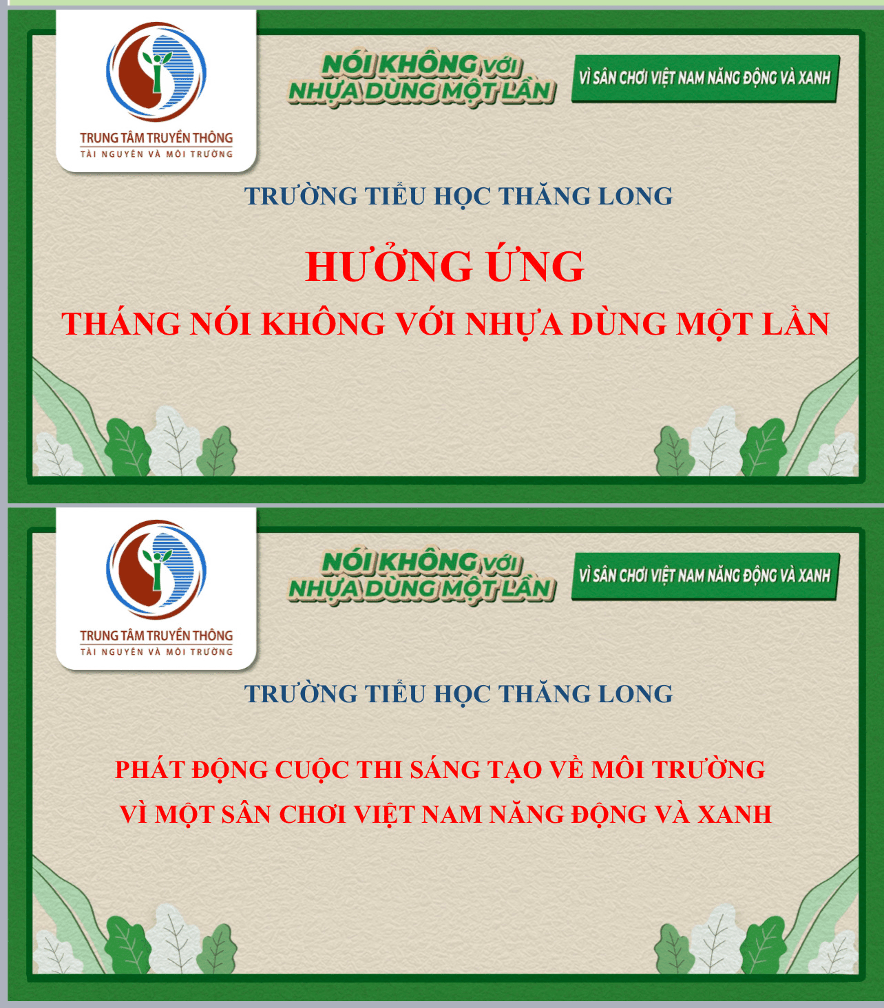 Nhằm đẩy mạnh triển khai các hoạt động thực hành xanh và tiếp tục giáo dục ý thức bảo vệ môi trường cho các em học sinh, trường Tiểu học Thăng Long đã phát động hưởng ứng “Tháng nói không với nhựa dùng một lần” và Cuộc thi Sáng tạo về môi trường “Vì một sân chơi Việt Nam năng động và xanh” được các em học sinh vô cùng hào hứng tham gia.