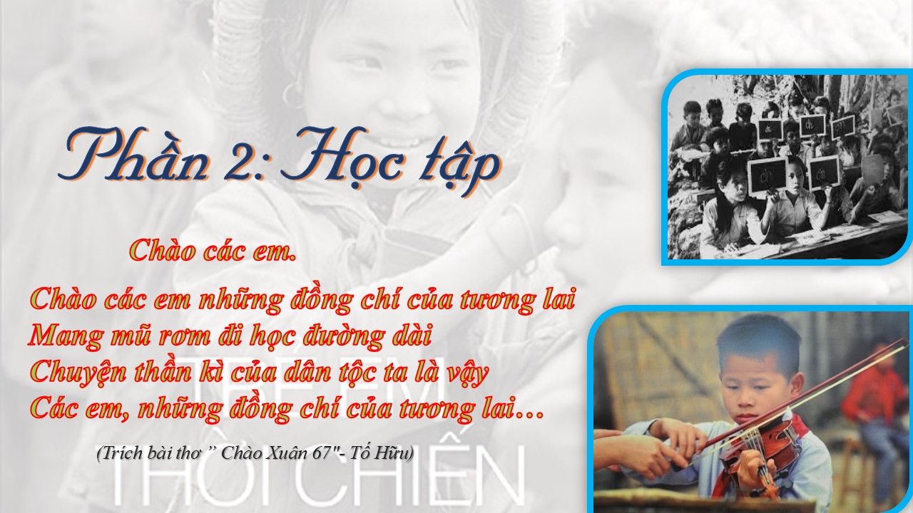 Những hình ảnh em bé trong cuộc sống thường ngày, trong sinh hoạt, trong học tập hiện lên rất sống động dưới ống kính của các nghệ sĩ nhiếp ảnh, phóng viên ảnh. Bom đạn ác liệt của kẻ thù không thể cướp đi sự ngây thơ, trong sáng của các em và không ngăn cản được bước chân các em đến trường. Lớp học thì dột nát, những chiếc bàn được thay bằng những chiếc ghế băng, lớp học tạm bợ có khi ngay tại nhà kho, tại sân đình. Học sinh đi học vừa ngồi học, vừa đội mũ, khi có bom đạn vội vã chạy xuống hầm. Những buổi khai giảng ngay cạnh hố bom, học sinh đầu đội mũ rơm, đi chân đất nhưng vẫn không thiếu cái không khí thiêng liêng của ngày đầu tiên các em đến lớp; vẫn đầy đủ cờ, hoa và ảnh Bác Hồ...