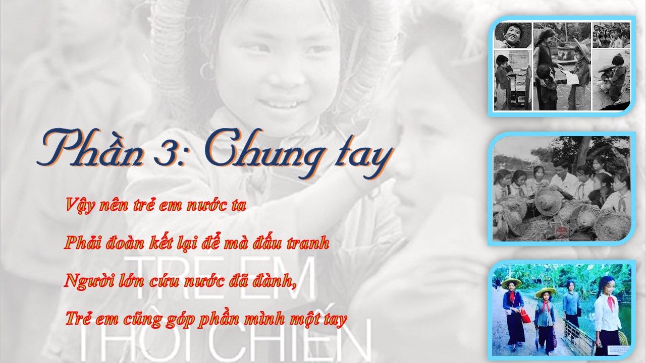Trong bom đạn chiến tranh, ta bắt gặp những hình ảnh em bé đi tránh bom, trú ẩn dưới hầm nhưng vẫn nở nụ cười trên khuôn mặt. Bức ảnh hai em bé trai đang ngồi ngay cửa hầm chữ A cho người xem thấy ở đây không có dấu hiệu của cuộc chiến; hay những lớp học múa, những buổi học vẽ, học đàn của trẻ em cũng vẫn diễn ra... Và sự khó khăn thì không sao kể hết: những bữa ăn đạm bạc, sự lao động nặng nhọc, vất vả để giúp đỡ cho gia đình: chăn trâu, khâu nón, gánh rơm, đào củ mang về ăn, tự tay đào hầm trú ẩn. Khi lớp học bị bom làm cháy, các em cũng chính là người đứng lên dựng lại trường, lại lớp...Trong cuộc sống vất vả ấy vẫn không thiếu tiếng cười. Bức ảnh các em tham gia kế hoạch nhỏ, mang những thành quả do mình làm ra nộp cho hợp tác xã: từ con gà tự nuôi đến quả trứng... Đó là một việc làm hết sức có ý nghĩa đối với lứa tuổi các em. Tuổi nhỏ làm việc nhỏ....