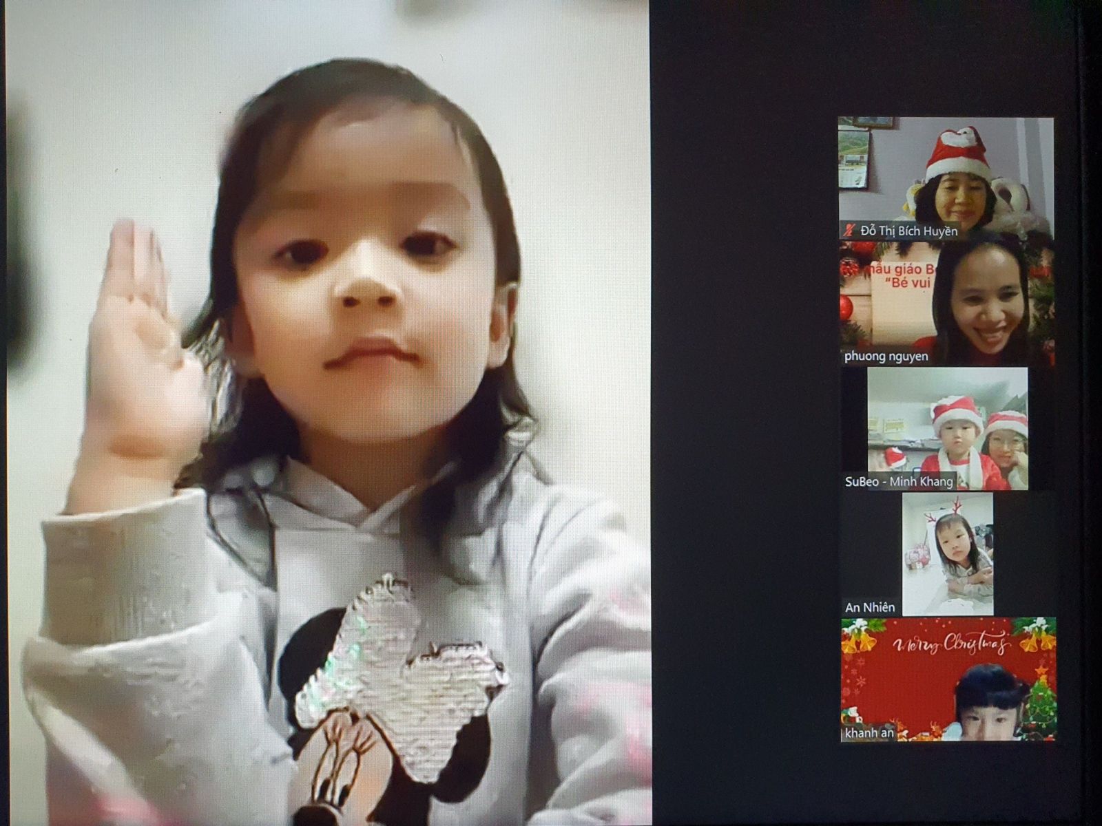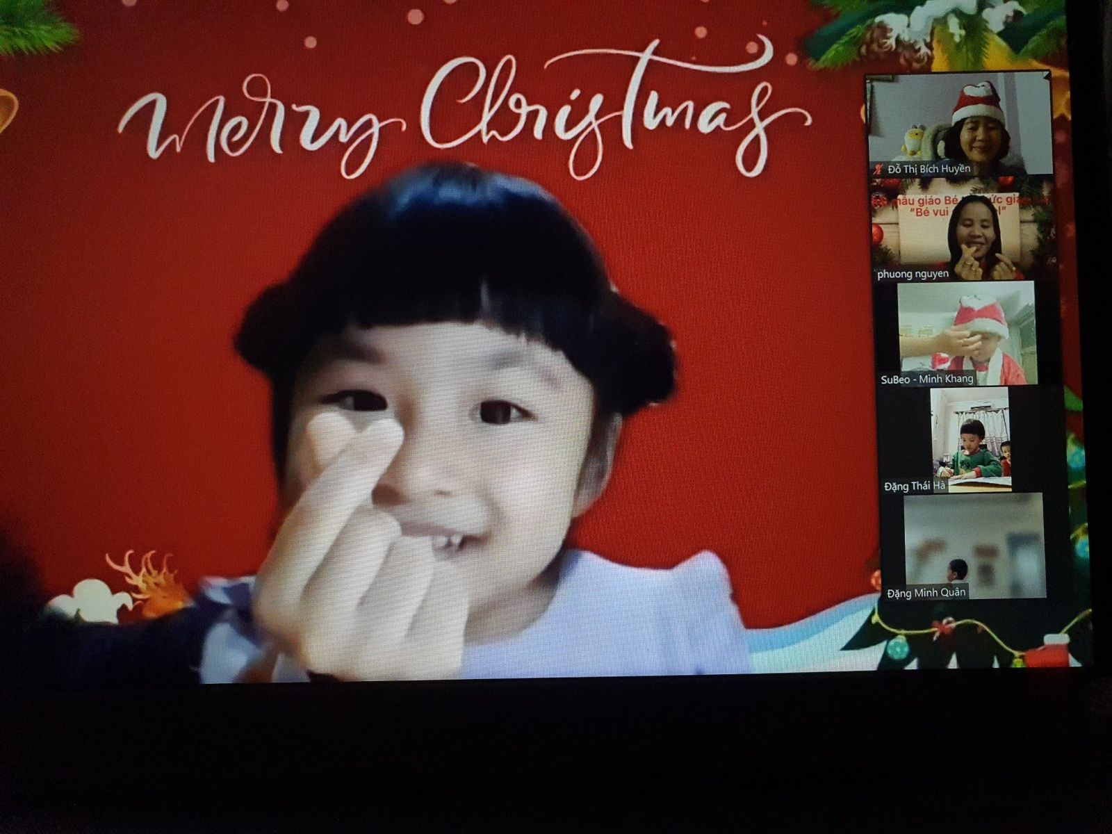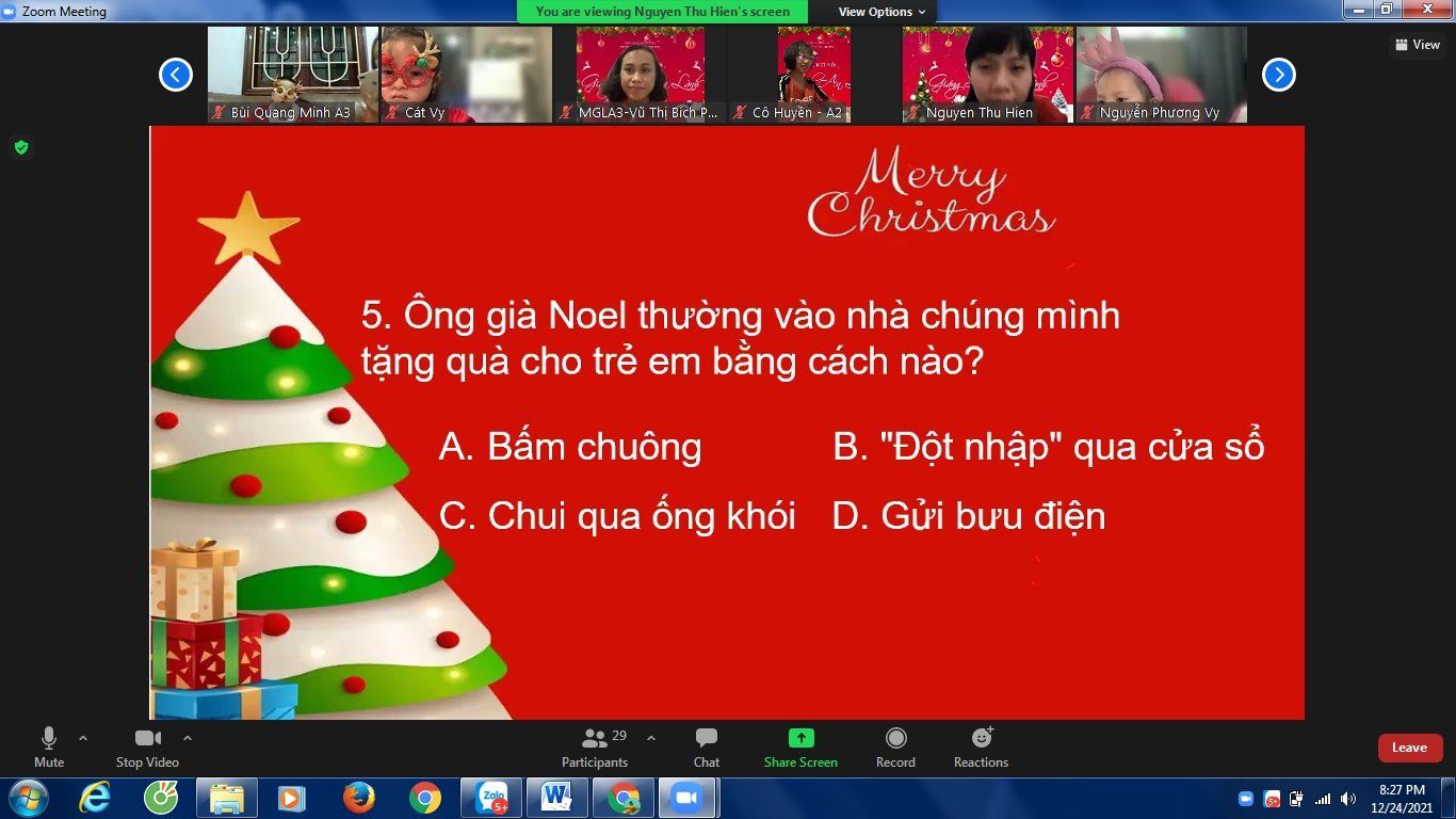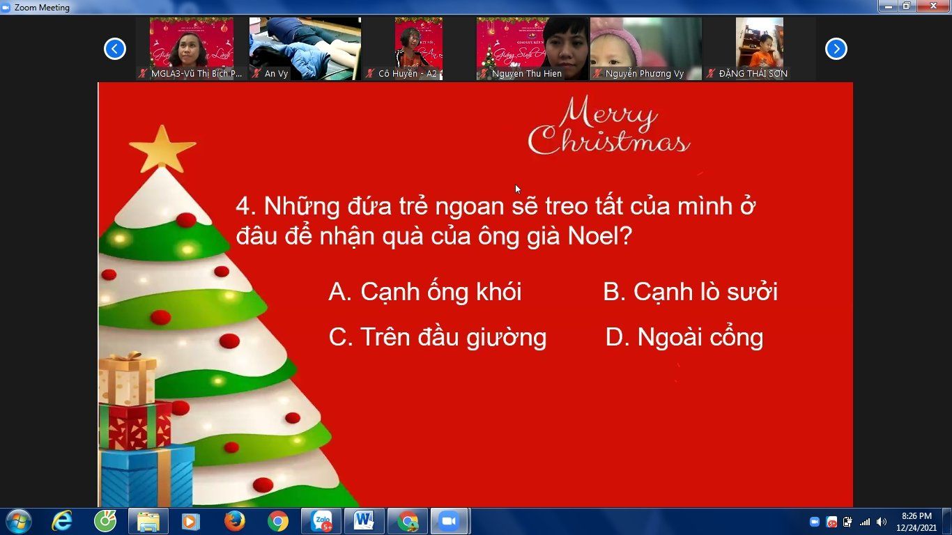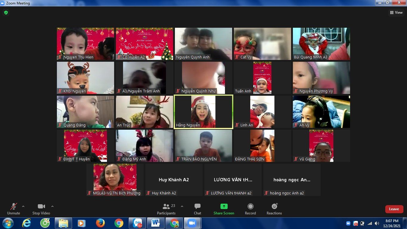 Noel hằng năm, các bé của Trường Mầm non Chim Non cũng đã làm rất nhiều đồ chơi trang trí lớp của mình để chào đón ông già Noel và năm mới, các bé còn được các cô luyện tập nhiều tiết mục văn nghệ để biểu diễn trong ngày Noel. Nhưng năm nay thật đặc biệt, do dịch bệnh covid-19 các bé phải nghỉ ở nhà để phòng dịch nhưng không ngừng tham gia các hoạt động với nhà trường. Tuy nhiên, để tạo cho trẻ có những buổi hoạt động ý nghĩa với cô giáo và các bạn, Trường Mầm non Chim Non đã tổ chức buổi giao lưu trực tuyến với các bạn nhỏ thân yêu trong trường.