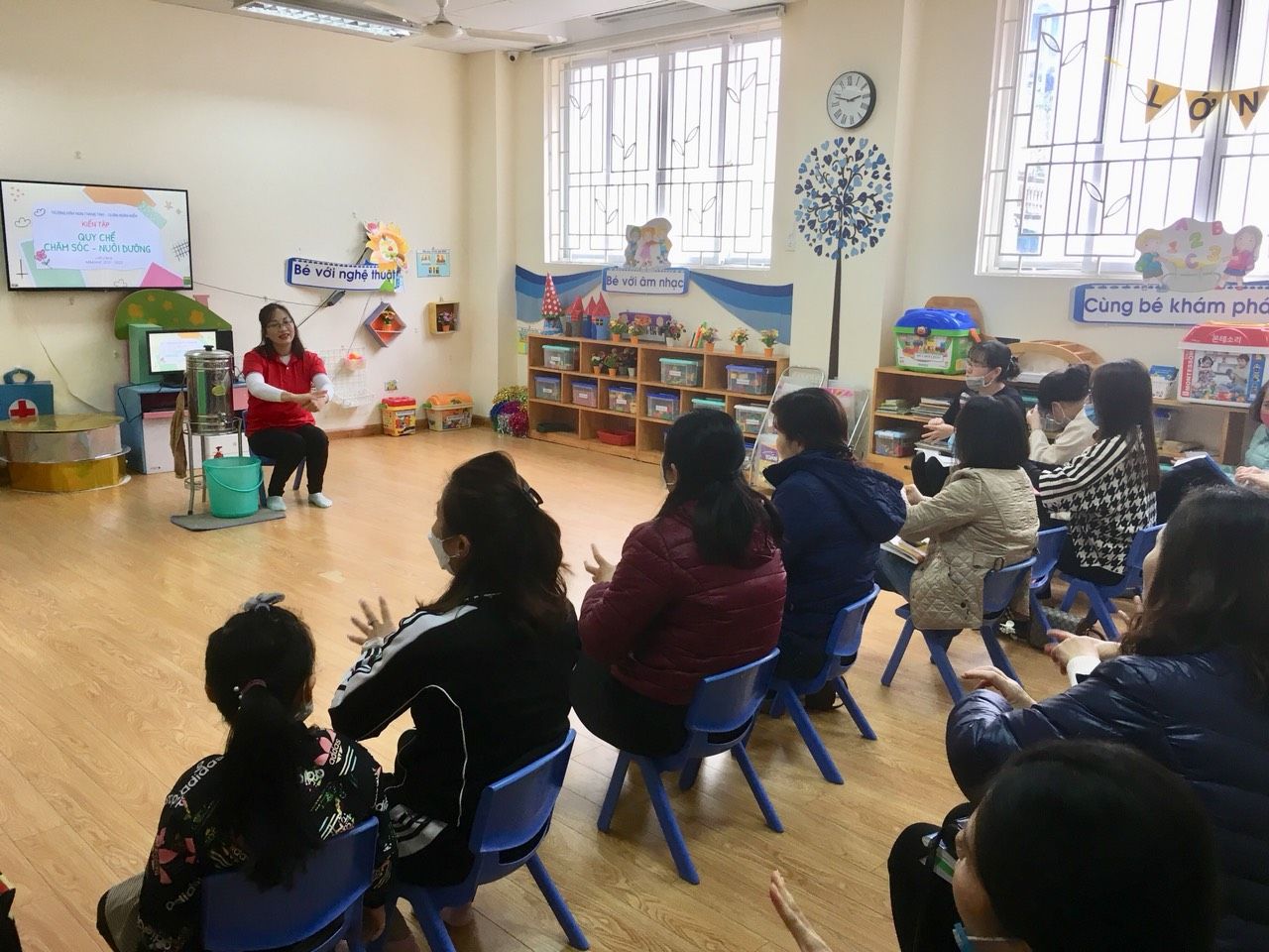 Trong buổi sinh hoạt, đồng chí Hiệu phó phụ trách về công tác giáo dục đã nêu rõ những nhiệm vụ chuyên môn đội ngũ cần thực hiện; công việc chung của tổ, nhóm cũng như công việc cá nhân mỗi giáo viên phải thực hiện trong năm học đầy khó khăn này. Trong đó, nhiệm vụ hàng đầu được đặt ra là xây dựng và thực hiện kế hoạch giáo dục nhà trường đáp ứng mục tiêu của chương trình giáo dục mầm non; thực hiện sinh hoạt tổ chuyên môn dựa trên nghiên cứu bài học để nâng cao năng lực sư phạm của đội ngũ nhà giáo với tinh thần “bồi dưỡng tại công việc”. Các thành viên trong tổ chuyên môn cũng đã tìm hiểu, nghiên cứu các nội dung theo kế hoạch; chia sẻ, trao đổi, thảo luận sôi nổi trong buổi sinh hoạt và đặc biệt giáo viên được thực hành thông qua các hoạt động.