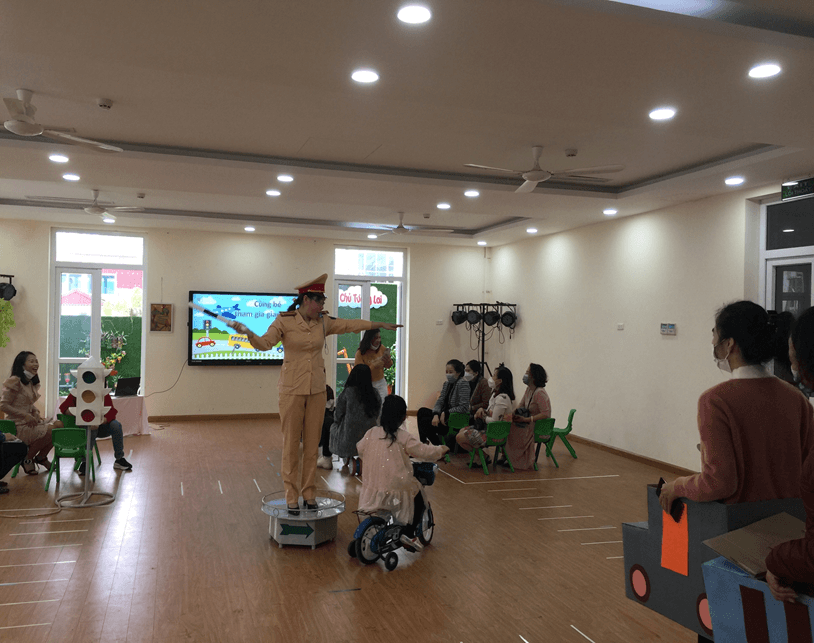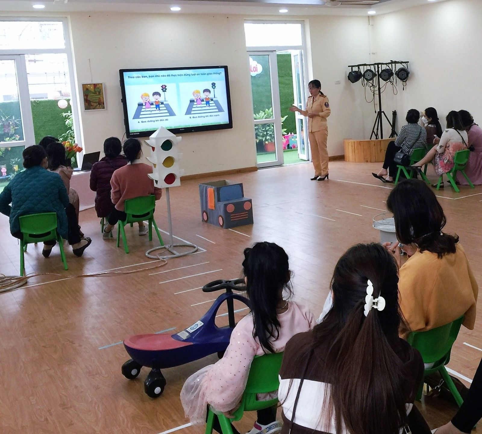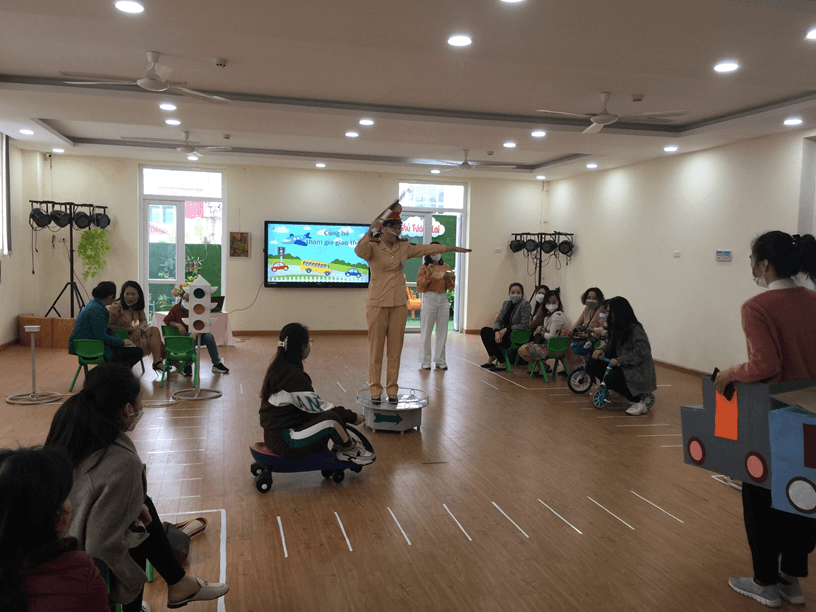 Cô giáo Lan Hương đã đưa đến các nội dung bổ ích về giáo dục giao thông an toàn và giáo viên được nhập vai của trẻ để tham gia các trò chơi về giao thông và tham gia giao thông bằng các PTGT mà các cô giáo tận dụng các nguyên vật liệu phế thải tạo ra cho trẻ.