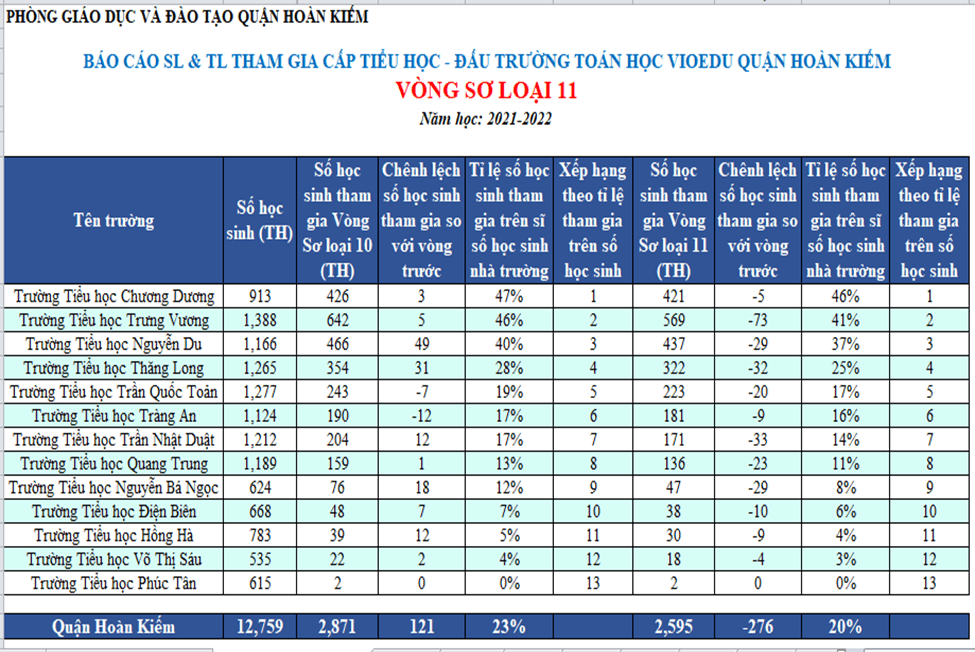 Trường Tiểu học Chương Dương cho thấy sân chơi này đã thực sự trở thành niềm vui, sự rèn luyện tích cực để nâng cao các kĩ năng toán học cho các bạn học sinh của trường Tiểu học Chương Dương nói riêng và các trường bạn trong quận. Trải qua 12 vòng sơ loại, học sinh trường Tiểu học Chương Dương luôn duy trì được số lượng học tham gia và tỉ lệ học sinh đạt top 100 quận Hoàn kiếm đều đạt từ mức 42->52 học sinh/mỗi vòng thi sơ loại. Thật vui mừng khi các em học sinh của trường Tiểu học Chương Dương liên tiếp nhiều vòng sơ loại đều dẫn đầu về số lượng học sinh tham gia và xếp hạng top 100 quận Hoàn Kiếm.