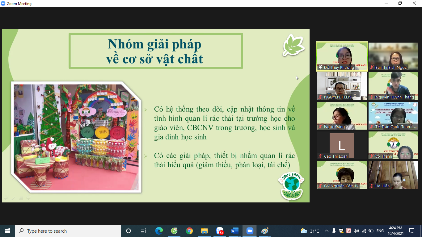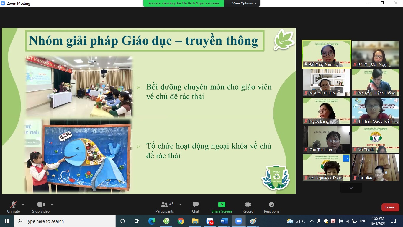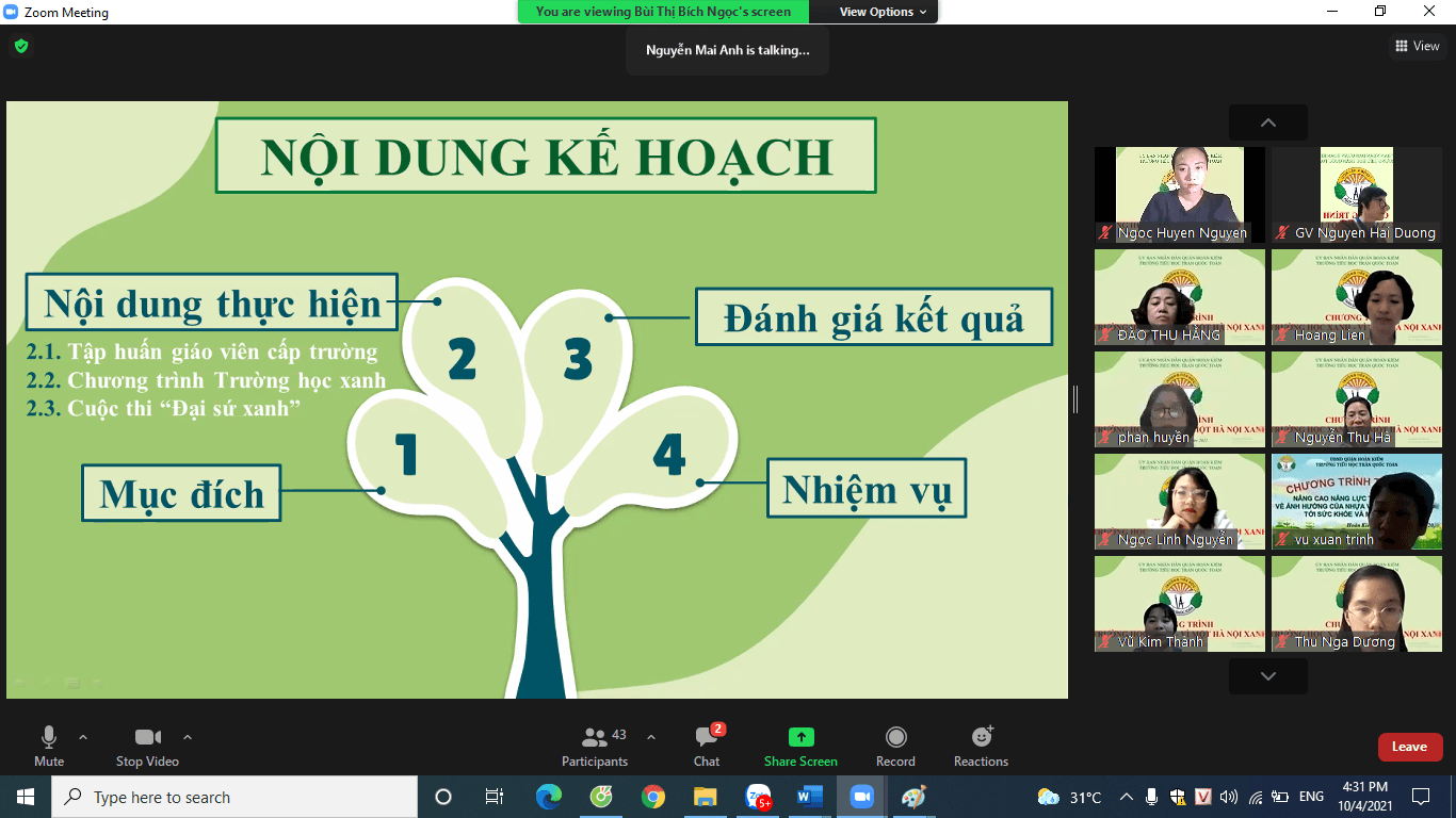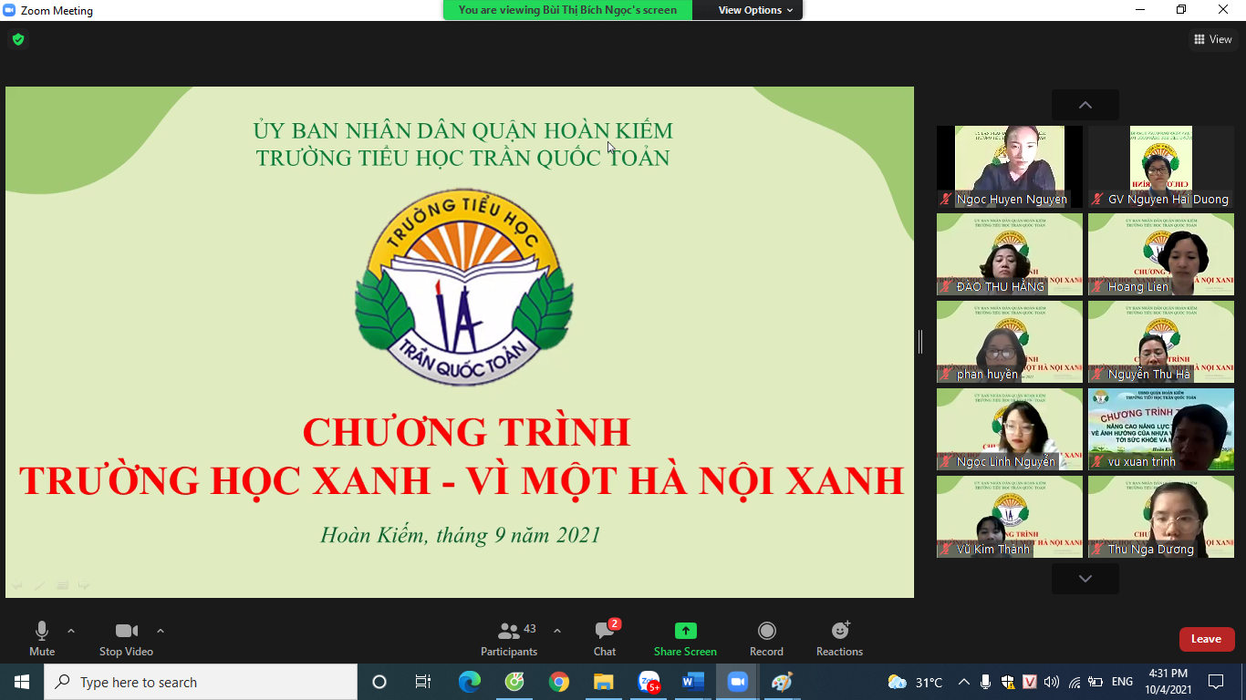 Thực hiện chỉ đạo của UBND Thành phố tại văn bản số 5609/VP-ĐT ngày 19/6/2019 về việc triển khai chương trình phối hợp về công tác bảo vệ môi trường của Bộ TNMT và Bộ GDĐT; Kế hoạch 3739/KH-STNMT-SGDĐT ngày 26/5/2021 của Sở TNMT và Sở GDĐT về “ Xây dựng Trường học xanh – Vì một Hà Nội xanh” trên địa bàn Thành phố Hà Nội năm 2021 - 2025; Công văn số 1291/UBND- TNMT ngày 09/9/2021 của UBND quận Hoàn Kiếm về việc tổ chức Chương trình “ Xây dựng Trường học xanh – Vì một Hà Nội xanh” tại các trường học trên địa bàn quận Hoàn Kiếm; kế hoạch số 237/KH-TNMT-GDĐT ngày 16/9/2021 về thực hiện Chương trình “ Xây dựng Trường học xanh – Vì một Hà Nội xanh” trên địa bàn Thành phố Hà Nội năm 2021 - 2025, vào chiều ngày 1/10/2021 trường Tiểu học Trần Quốc Toản đã tổ chức tập huấn chương trình “Xây dựng trường học Xanh - Vì một Hà Nội xanh” cho toàn thể cán bộ giáo viên và nhân viên nhà trường.