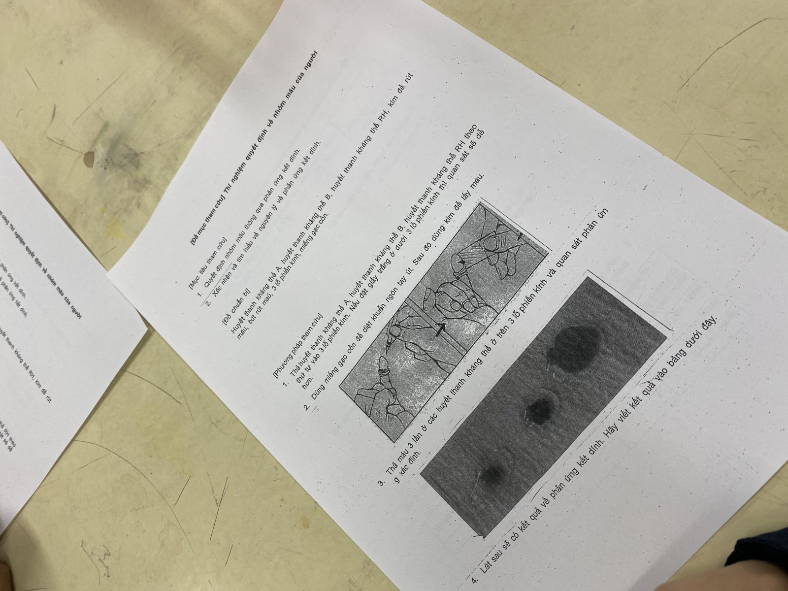 1. Xét nghiệm về nhóm máu của người. Ở thí nghiệm này chúng em xác định được nhóm máu của mình.