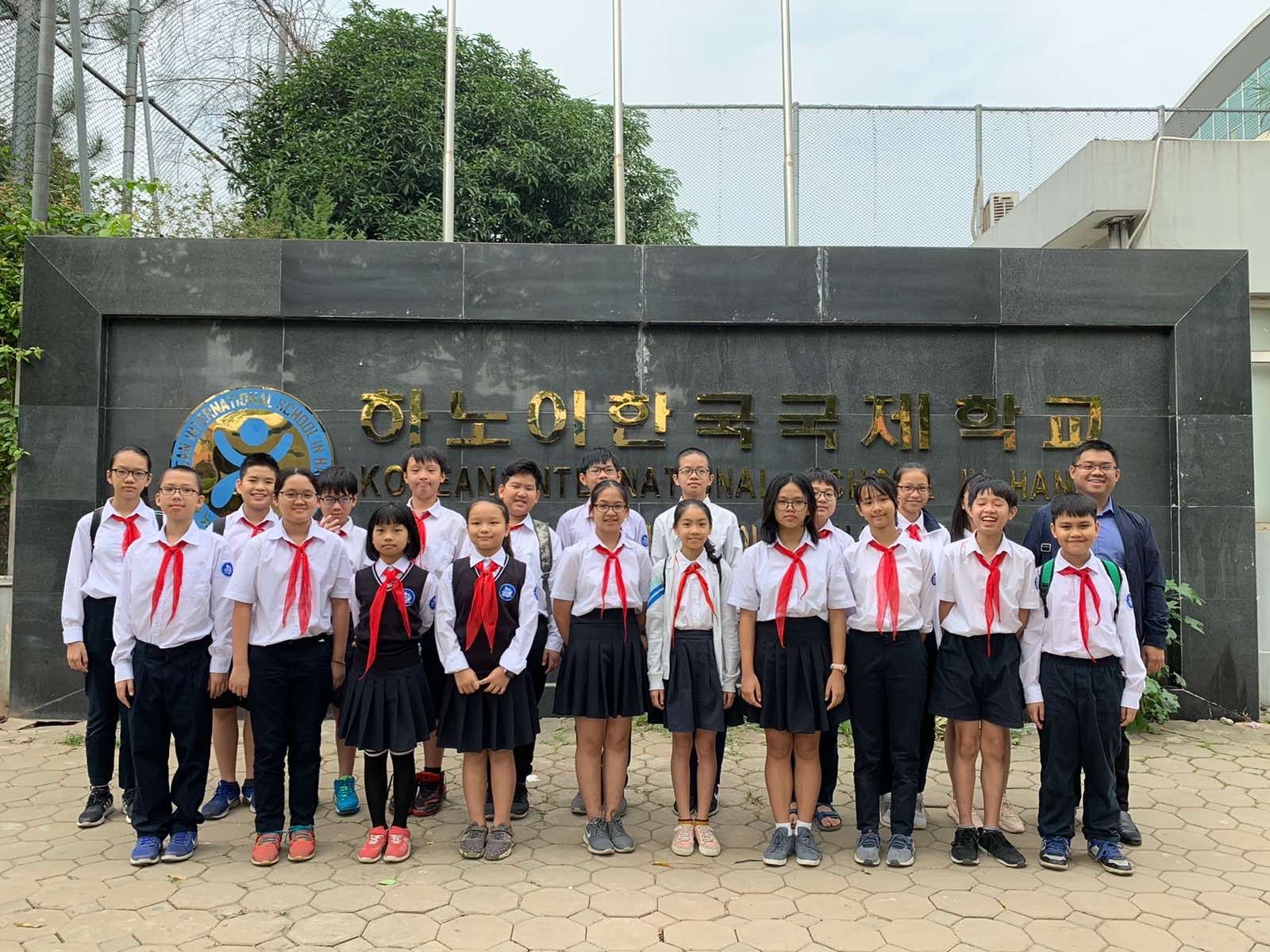 10 giờ sáng xe đến cổng trường KISH, cả nhóm chạy ào xuống và ấn tượng đầu tiên khi em nhìn thấy trường Kish là một ngôi trường rất to và đẹp. Chữ tiếng Anh và tiếng Hàn ghi tên trường thật nổi bật, nhưng em chỉ đọc được tiếng Anh “Korean International School in Ha Noi”. Cô giáo ra đón chúng em nói tiếng Anh nên bọn em đều hiểu được. Cô dẫn chúng em vào hội trường và ở đây thầy Hiệu trưởng trường KISH đã chào mừng cả đoàn bằng tiếng Hàn. Nhờ có phiên dịch, chúng em hiểu đây là lần thứ tư học sinh trường Kish và trường Trưng Vương giao lưu với nhau. Thầy chúc chúng em có một ngày hoạt động vui vẻ và hy vọng hoạt động này sẽ luôn tiếp diễn.
